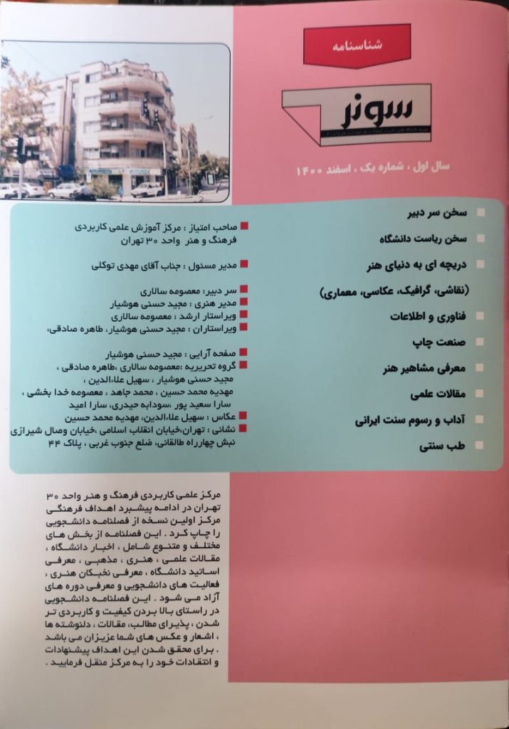 فصل نامه سونر در دانشگاه واحد 30 به صورت فصلی چاپ می شود و شامل فعالیت های دانشگاه و بسیاری مطالب دیگر است. برای دریافت فایل فصل نامه ها می توانید با کلیک بر روی دکمه هایی که در انتهای این صفحه قرار دارد آن را دریافت کنید